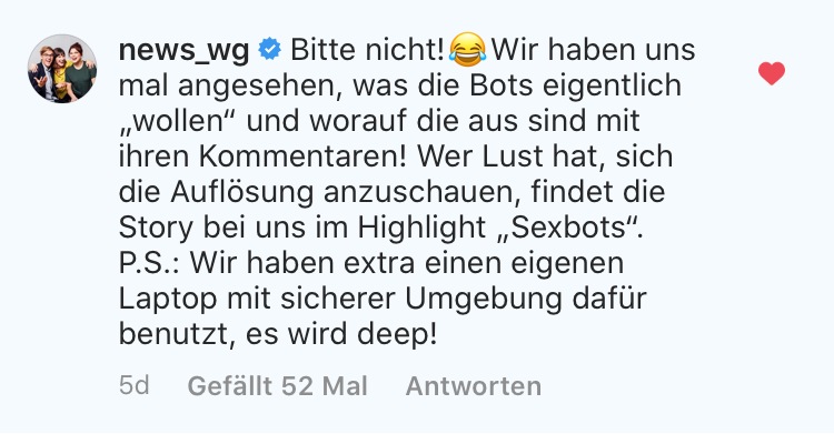Du willst dringend Sexbot-Comments absetzen, aber folgst uns noch nicht auf Instagram? Dann aber los: