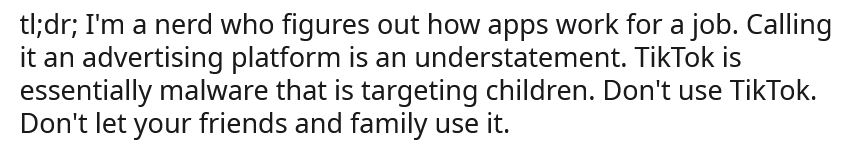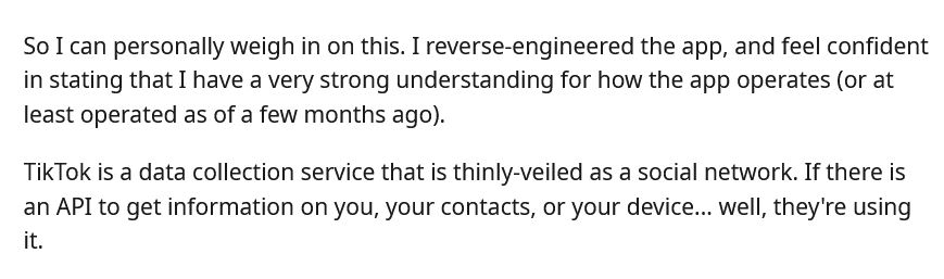 Im April berichtete der Reddit-User bangorlol, dass er aus beruflichen Gründen TikTok bis ins kleinste Detail untersucht hatte. Er war erschrocken, in welchem Ausmaß die App Informationen sammelt und dass viele Einstellungen ferngesteuert werden können. Er bezeichnete TikTok als Malware und empfahl die sofortige Deinstallation.