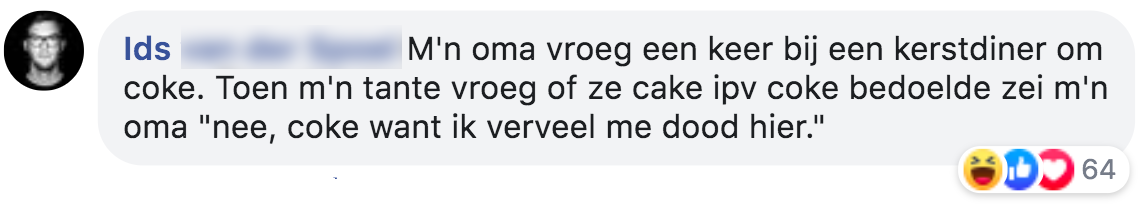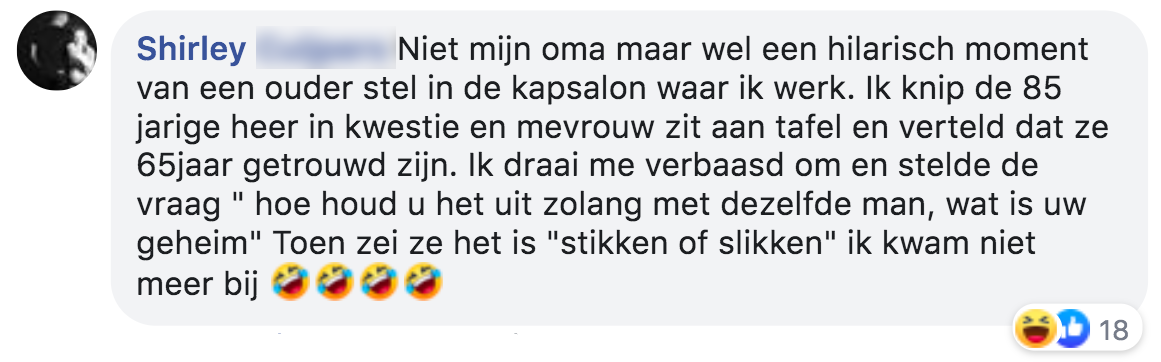 Na een blog vol met oma-anekdotes, deelden jullie enthousiast eigen verhalen over oma’s en ouderen. Ze bleven maar binnenstromen. Dus trokken we met jullie nog een blik open vol onvergetelijk uitspraken en acties van jullie oma’s.
