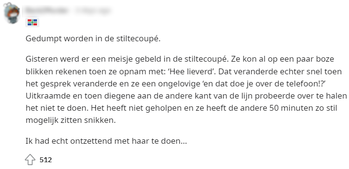 6. Deze situatie had wel voorkomen kunnen worden als ze in eerste instantie d’r telefoon niet had opgenomen (bellen in een coupé: ook irri). Al verdient niemand dit natuurlijk.