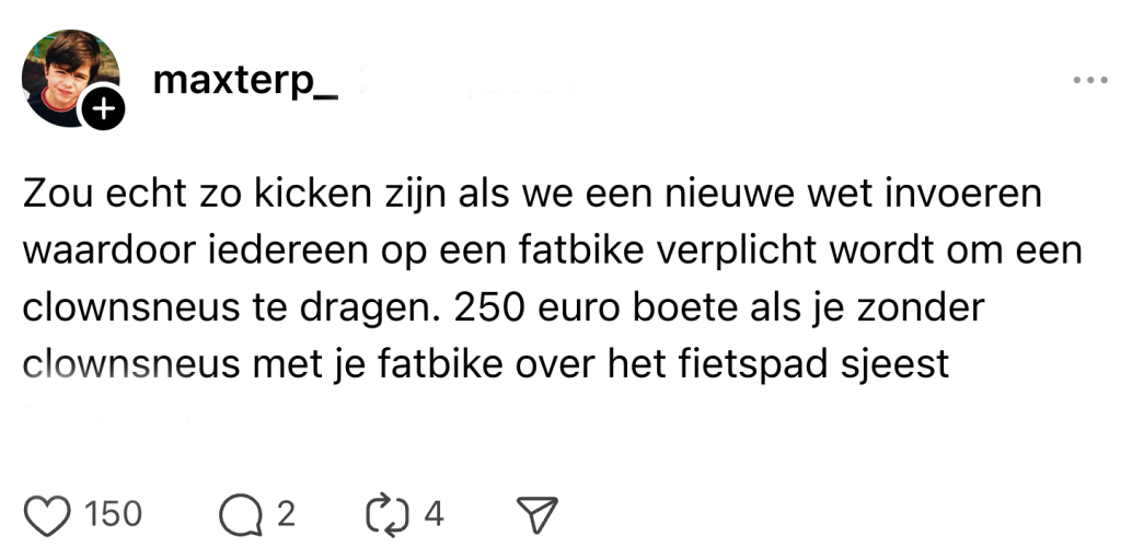 Je hebt ze vast al gespot: die infantiele tweewielers met tractorbanden, die harder gaan dan je op je stadsfiets ooit zult trappen. Fatbikes. Voor de één een zegen, voor de ander de wortelkanaalbehandeling onder de voertuigen. Waar je vroeger alleen wielrenners vervloekte omdat ze blijkbaar heel graag jouw bumper wilden koppen, moet je nu ook nog oppassen voor een horde pubers die met 30 km/h voorbij scheuren alsof ze Max Verstappen himself zijn. En terwijl jij je te pletter trapt op je gammele omafiets, scheuren ze krijsend langs je heen zonder ook maar één zweetdruppel te verliezen. Als je geen fan bent van deze rijdende tanks, ben je gelukkig niet de enige.