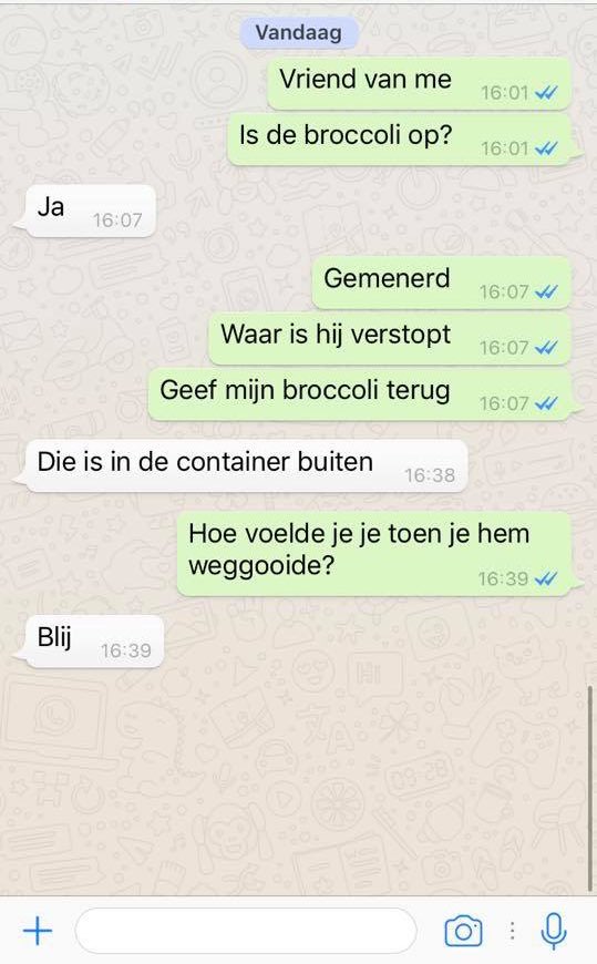 Bij mijn ex en mij was het aan de ene kant broccoli die mijn hand vasthield en aan mijn andere arm mijn vriend die de broccoli achter mijn rug tegen zijn stengel trapte. Is nu uit gelukkig. pic.twitter.com/EaybiyHjWn
