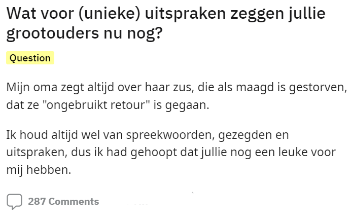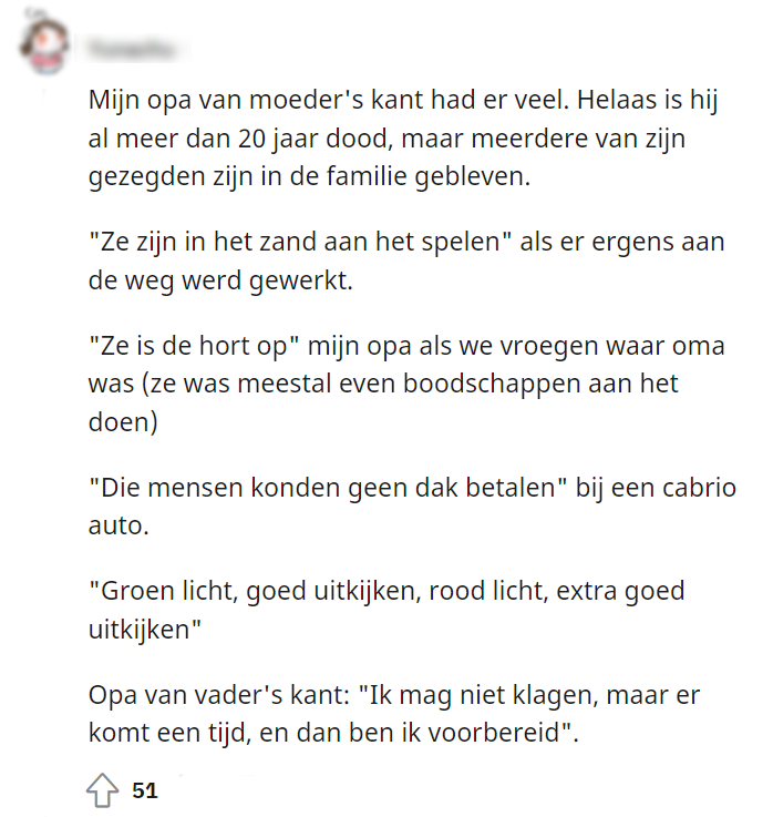 Grootouders weten over het algemeen net wat beter hoe de wereld in elkaar zit dan dat wij doen. Je zou ook denken dat ze met hun voorsprong op het leven over meer ‘wijsheid’ beschikken. Deze Reddit-gebruiker wilde weten welke unieke uitspraken van grootouders tot op de dag van vandaag nog bestaan. Hoewel niet alle uitspraken heel wijs zijn, zijn ze wel enorm ‘bijzonder’ en zeker het lezen waard.