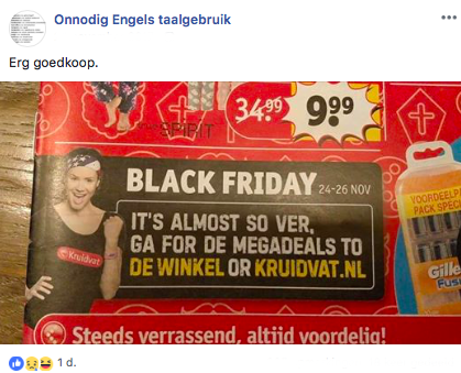 We hebben het al eerder in 2019 gezegd, maar we doen het gewoon nog een keer: volg Onnodig Engels taalgebruik op Facebook. Hierop worden de meest tenenkrommende kiekjes van, jawel, onnodig Engels taalgebruik gedeeld. Dus als jij ook helemaal gek wordt van alle onnozele Engelse termen die overal maar opgeplakt worden dan hebben wij het perfecte lijstje voor jou!