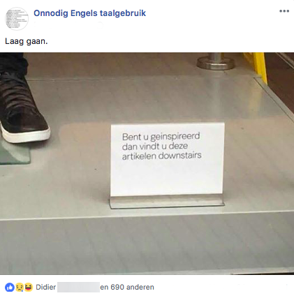 We hebben het al eerder in 2019 gezegd, maar we doen het gewoon nog een keer: volg Onnodig Engels taalgebruik op Facebook. Hierop worden de meest tenenkrommende kiekjes van, jawel, onnodig Engels taalgebruik gedeeld. Dus als jij ook helemaal gek wordt van alle onnozele Engelse termen die overal maar opgeplakt worden dan hebben wij het perfecte lijstje voor jou!