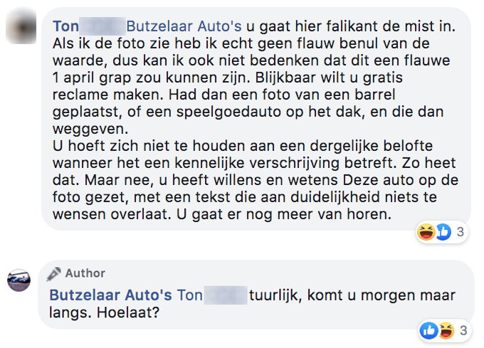 Zo zie je maar weer dat humor een erg subjectief begrip is. Ook op 1 april. Hoe dan ook, deze autodealer had een grapje in gedachten met een bijbehorende glimmende Facebookpost. De auto lijkt echter een uitlaatklep te hebben voor een hoop uiteenlopende reacties. Gezellig.