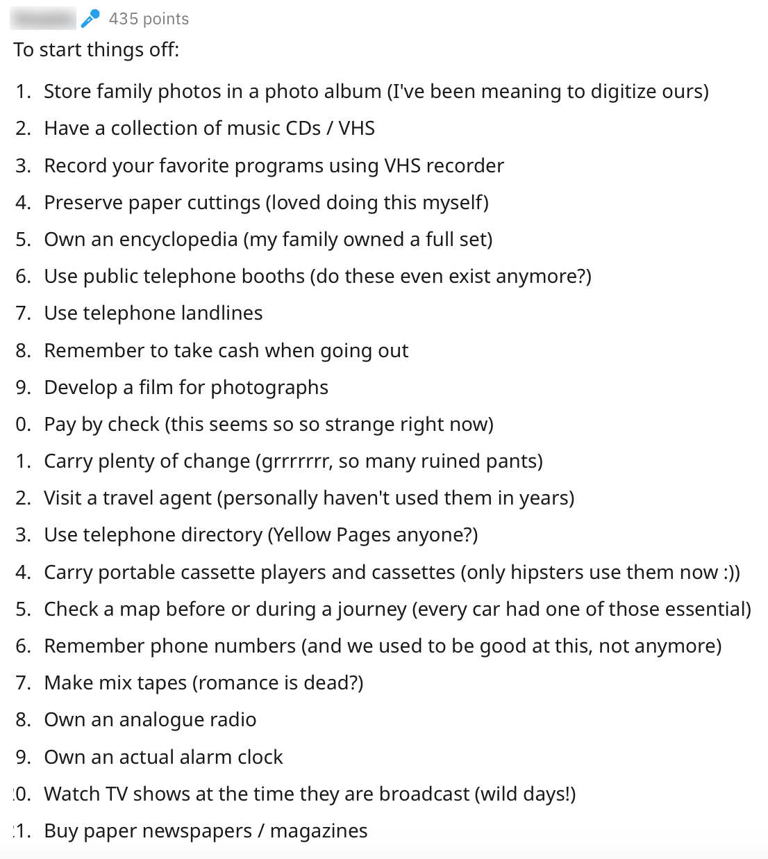 Het jaar 2000 is al bijna een kwart eeuw geleden, maar toch voelt het voor sommigen alsof het nog maar een paar jaar terug was. Er zijn een hoop dingen drastisch veranderd. In dit draadje vroeg een Reddit-gebruiker naar dingen die normaal waren in 2000, maar best wel vreemd zouden zijn in 2020. Wij hebben de leukste reacties voor je op een rijtje gezet.