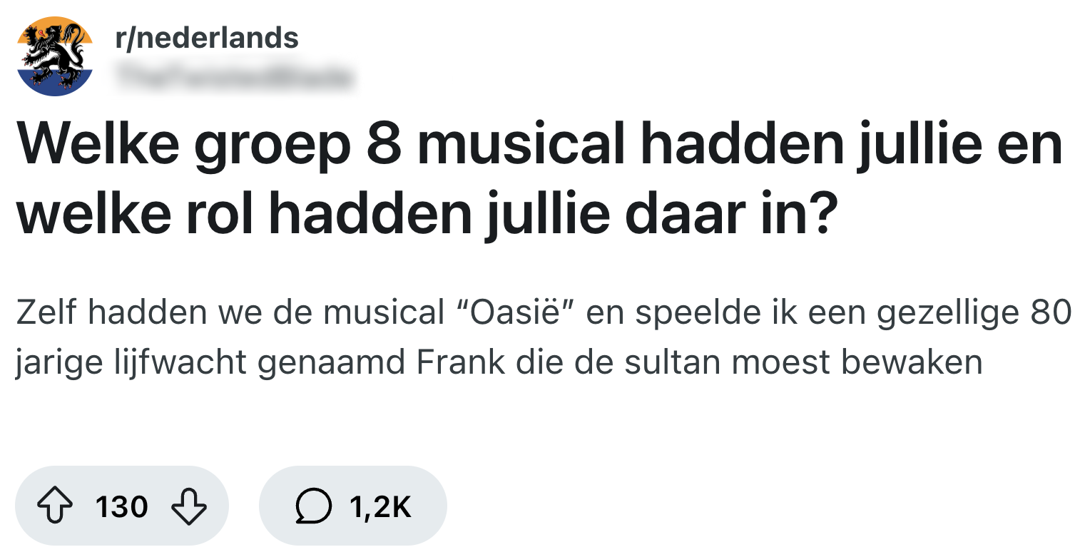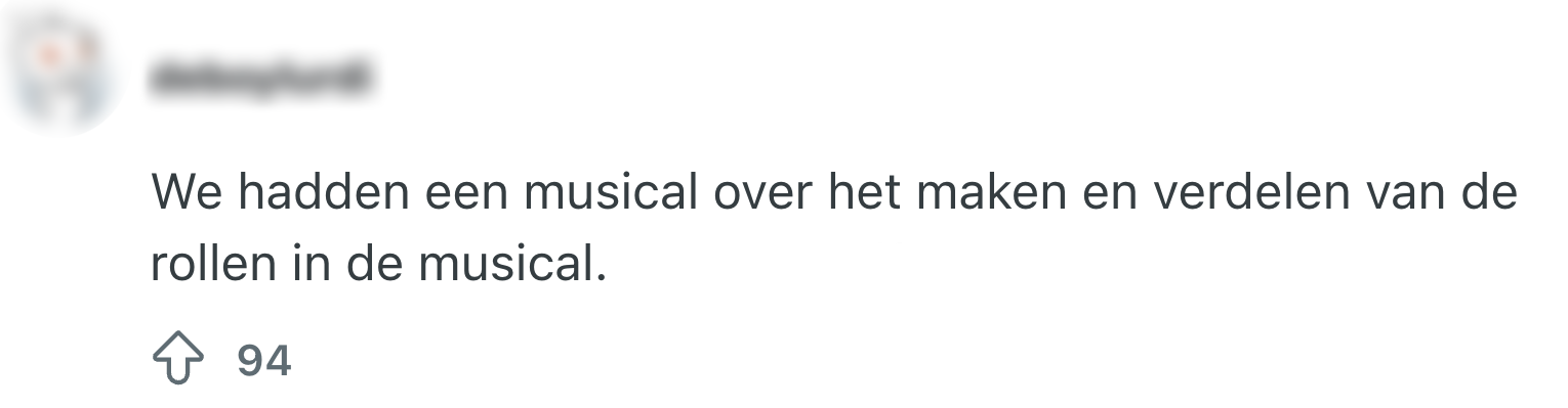 De meesten van ons zijn groep acht al een hele tijd geleden ontgroeid. Toch blijft die periode je voor altijd bij, vanwege het schoolkamp, de Cito-toetsen en natuurlijk de eindmusical. Of je er nou jarenlang naar uitkeek of niet kon wachten tot-ie voorbij was: zo’n musical vergeet je niet snel. Een Reddit-gebruiker vraagt zich af met welke afscheidsmusical anderen groep acht hebben afgesloten en roept flink wat nostalgie op.
