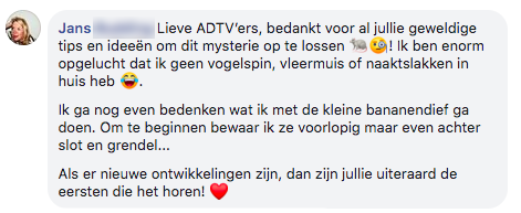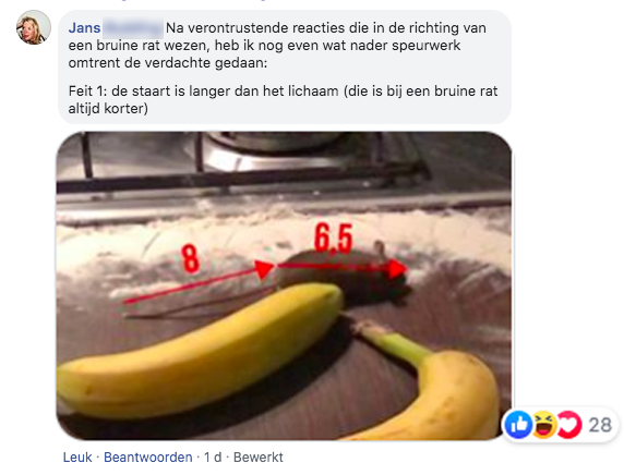 Vledder en de Cock eat your heart out. There’s a new kid in town en haar naam is Jans. Jans zat met een vraag: haar bananen werden continu aangevreten. Muizen, zou je denken, maar er was in geen velden of wegen een keutel te bekennen. Dus gooide ze haar vraag op Facebook. Het resultaat: een bloedstollend spannende zoektocht naar deze bananendief. Én een heterdaadje.