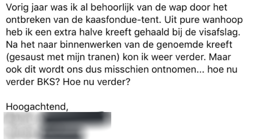 Ik ga echt stuk door die zin “Vorig jaar was ik al behoorlijk van de wap door het ontbreken van de kaasfondue-tent.” Epitome van firstworld problems lbr
