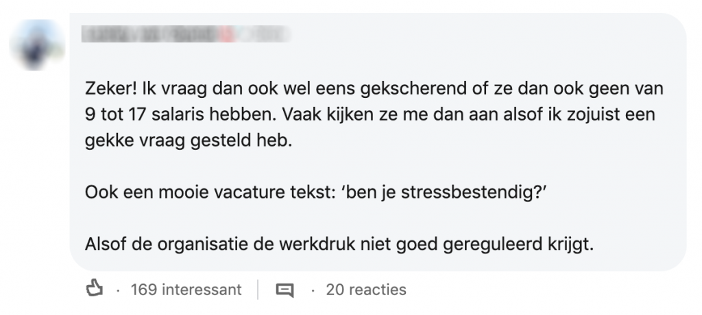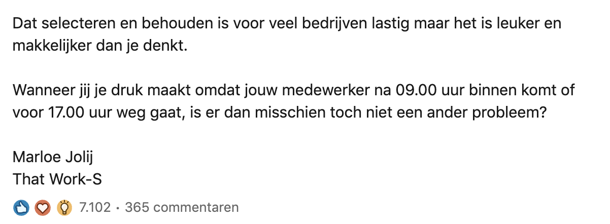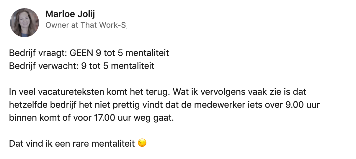 Marloe is ondernemer met een passie voor recruitment en sales. Het viel haar op dat veel bedrijven in hun vacatures aangeven dat ze geen 9 tot 5 mentaliteit vragen, maar dat ze dit in de praktijk wel verwachten. Ze deelde op Linkedin hoe zij hier tegenaan kijkt.