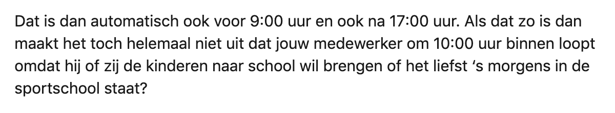 3. Zo lang de medewerkers hun werk doen, moet het volgens haar niet uitmaken op welk tijdstip dit is.