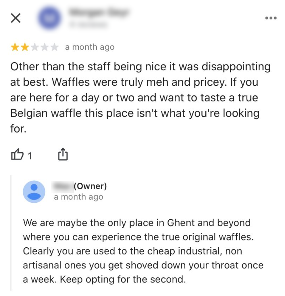 Jammie! Je bent in België en welke lekkernij kun je dan zeker niet overslaan? De wafel natuurlijk! Alhoewel, niet bij déze tent. Tenminste, als je de recensies moet geloven. Die zijn namelijk niet erg positief. Wat ook niet geheel positief is, zijn de reacties hierop van de eigenaar zelf.