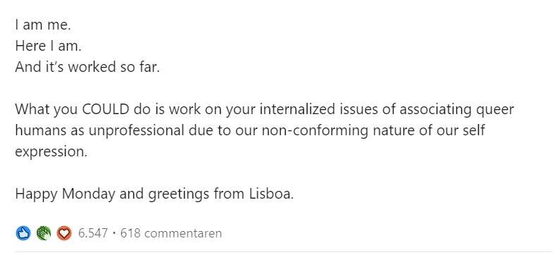 3. Hij geeft de critici ook een opdracht: denkt zélf eens na waarom je queer als onprofessioneel beschouwt.