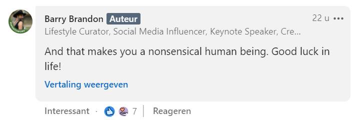 Influencer Barry Brandon heeft er zijn levensdoel van gemaakt dat iedereen altijd en overal zichzelf kan zijn. Al geven mensen Barry zelf niet altijd het gevoel dat híj altijd en overal mag zijn wie hij wil zijn. Zo sprak iemand hem er laatst op aan dat zijn queerness niet op LinkedIn thuishoort. Als reactie daarop deelt Barry een burn uit, en het internet valt hem bij.