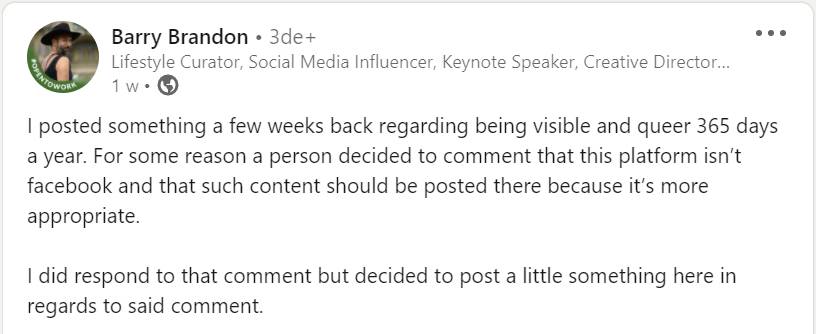 1. Barry begint zijn verhaal met een situatie van een paar weken geleden. Iemand vond zijn queerness niet echt LinkedIn-material.