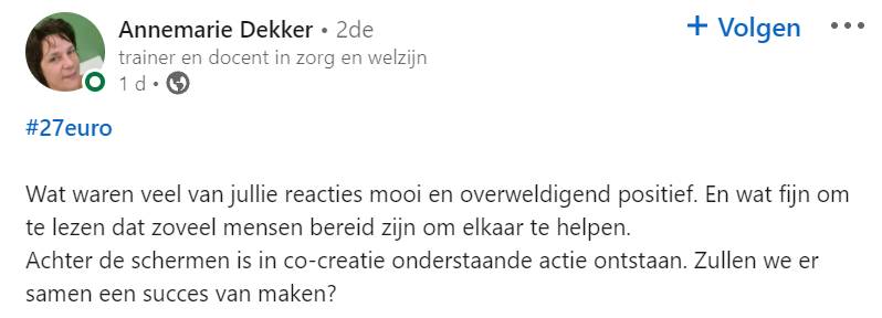 14. Annemarie wil de vrouw in kwestie niet in een ongemakkelijke positie plaatsen door al deze liefdadigheid. Wel doet ze iets anders met alle berichten: samen roepen Annemarie en haar nieuwe netwerk de hashtag #27euro in het leven. Iedereen die het kleine bedrag kan missen om iets moois voor een ander te doen is meer dan welkom om zich aan te sluiten. Mooi toch?