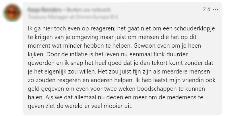 Geen saldo. Ook jij hebt het vast eens meegemaakt dat dat op de pinautomaat verscheen. Toch even pijnlijk. Vorige week overkwam het een vrouw in een Ermelose supermarkt. Gelukkig was daar Annemarie, die haar voor haar boodschappen betaalde. Annemarie plaatste het verhaal over die situatie op haar LinkedIn en dat kreeg niet alleen veel reacties, maar ook een mooi staartje.