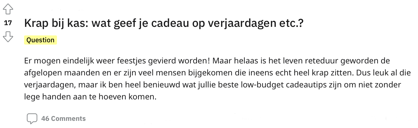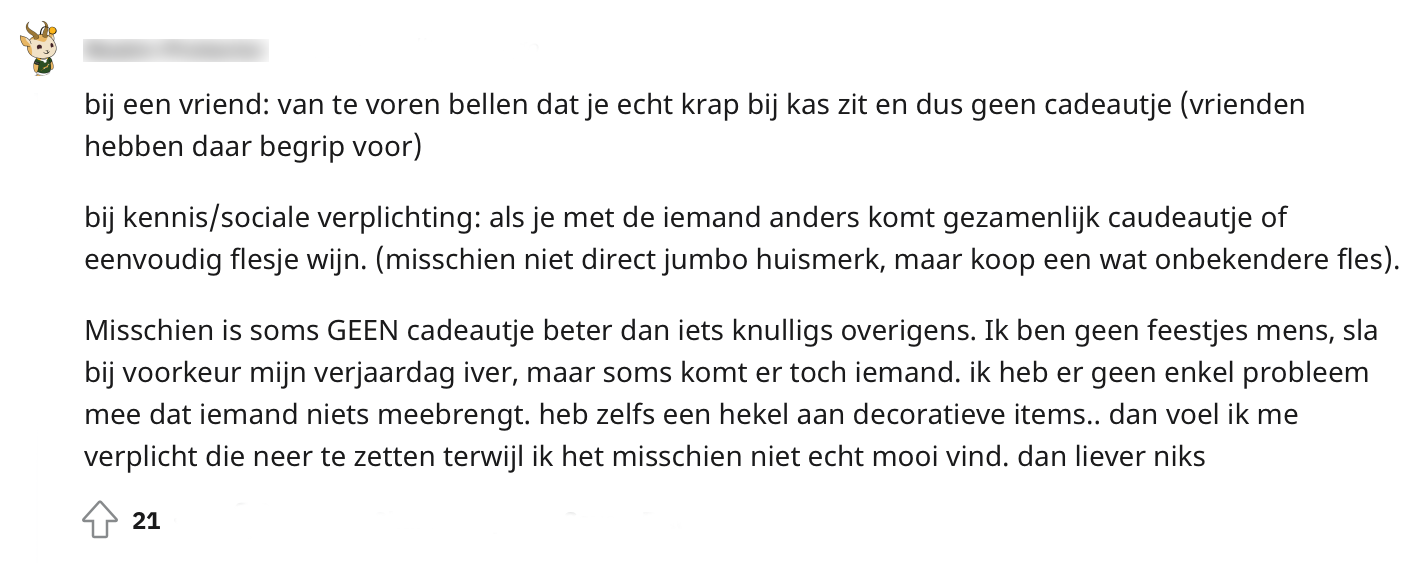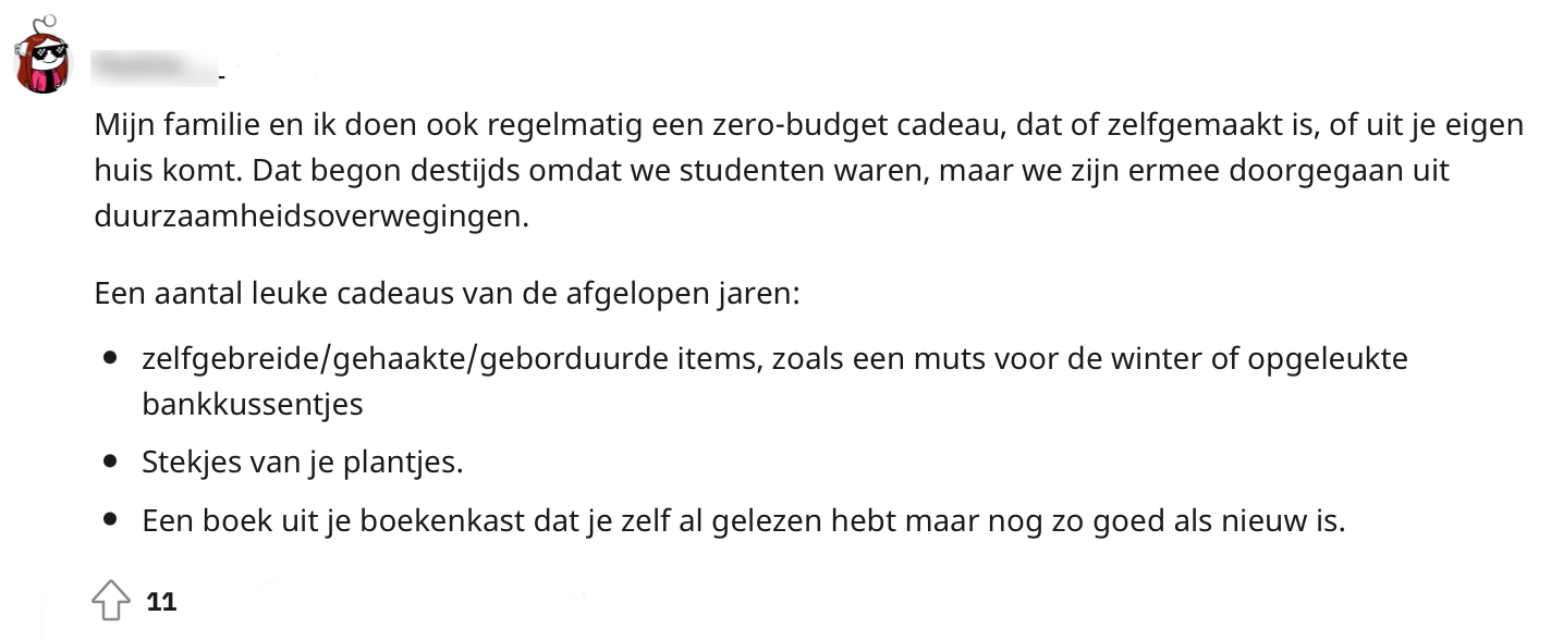 We hebben allemaal wel eens krap bij kas gezeten (of zitten dit nog steeds). Het kan dan best lastig zijn als je uitgenodigd wordt voor een verjaardag, maar eigenlijk geen budget hebt om een cadeau te kopen. Daarom werd op Reddit gevraagd naar inspiratie voor cadeaus als je niet zo veel te besteden hebt. Uit de reacties blijkt dat er genoeg opties zijn en dat je met creativiteit vaak al een heel eind komt.