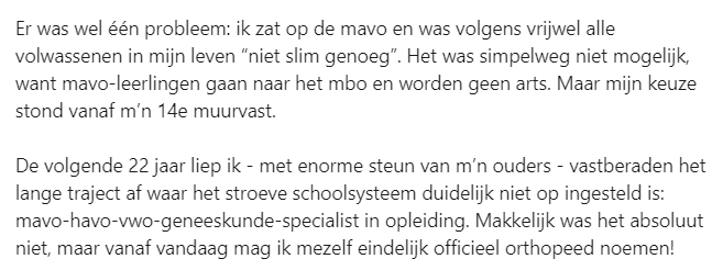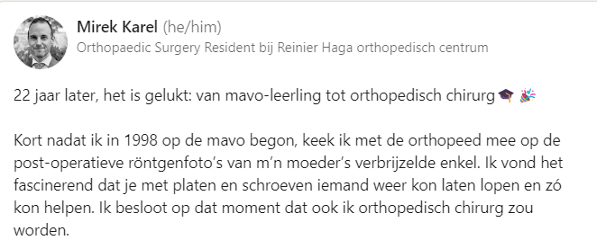 Van een behaald diploma tot een fijne promotie: LinkedIn staat vol met succesverhalen. Wie in deze oceaan aan succesverhalen tóch nog weet op te vallen is Mirek. Hij is met zijn mavo-diploma uiteindelijk chirurg geworden: een inspiratie dus!