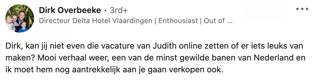 Hoe ga je tegenwoordig nog opvallen met een vacature, zeker als er bij veel bedrijven al sprake is van een enorm personeelstekort? Hoteldirecteur Dirk Overbeeke liep naar eigen zeggen ’twee weken met zijn ziel onder zijn arm’ omdat hij niet wist wat hij met een nieuwe vacature aan moest, ging vervolgens een flink potje omdenken en besloot er uiteindelijk geen doekjes om te winden. En met succes, want met de onderstaande tekst wist ‘ie de aandacht van vrijwel alle Nederlandse LinkedIn-gebruikers te trekken.