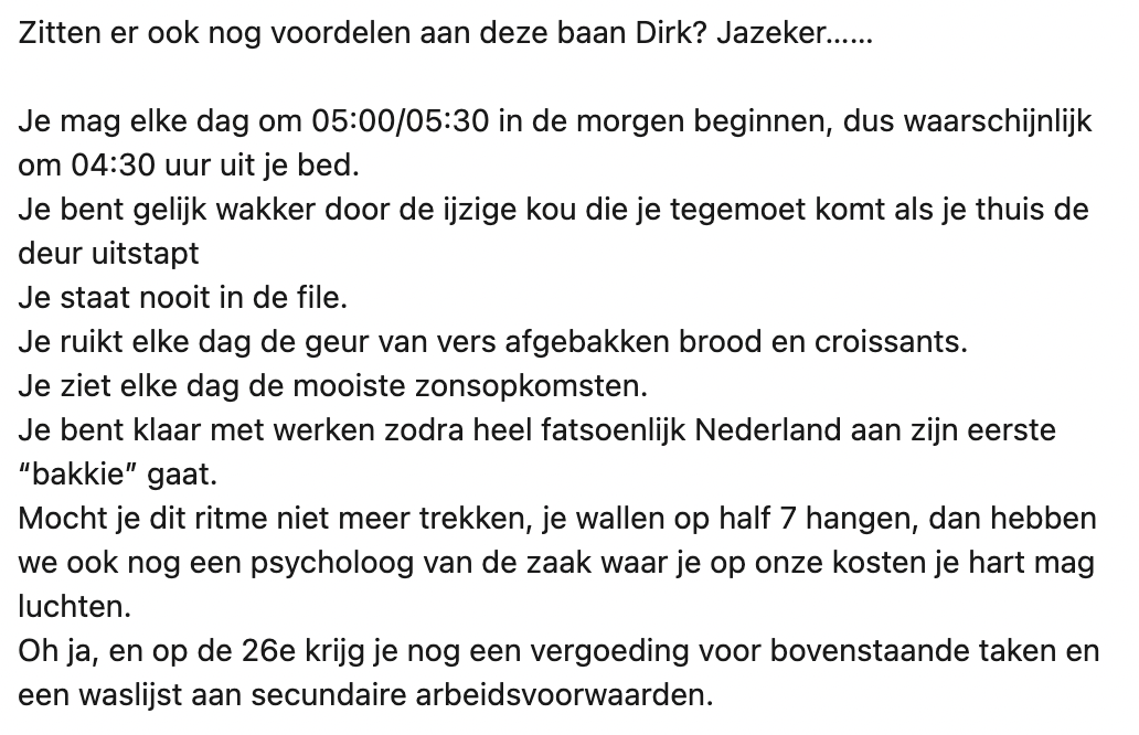 2. Dat valt te begrijpen, want zoals Dirk het omschrijft lijkt er inderdaad weinig aan (op het werken met croissants na, dan).