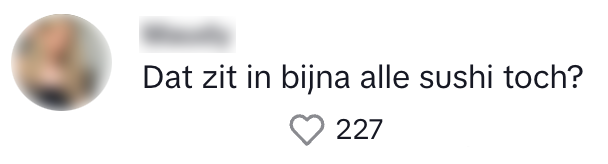 Waar de een het liefst een simpele AVG naar binnen werkt, gaat de ander voor een flinke dosis sushi. Ja, je weet wel, zo’n rijstbal met een plak rauwe vis eroverheen. Voorheen moest je hiervoor een gespecialiseerd restaurant opzoeken, maar tegenwoordig kan je de rijsthapjes ook gewoon op de versafdeling van de supermarkt vinden. Parbella koopt een bakje sushi bij Jumbo, maar ontdekt vervolgens een onverwacht ingrediënt waarvan ze effe perplex staat.