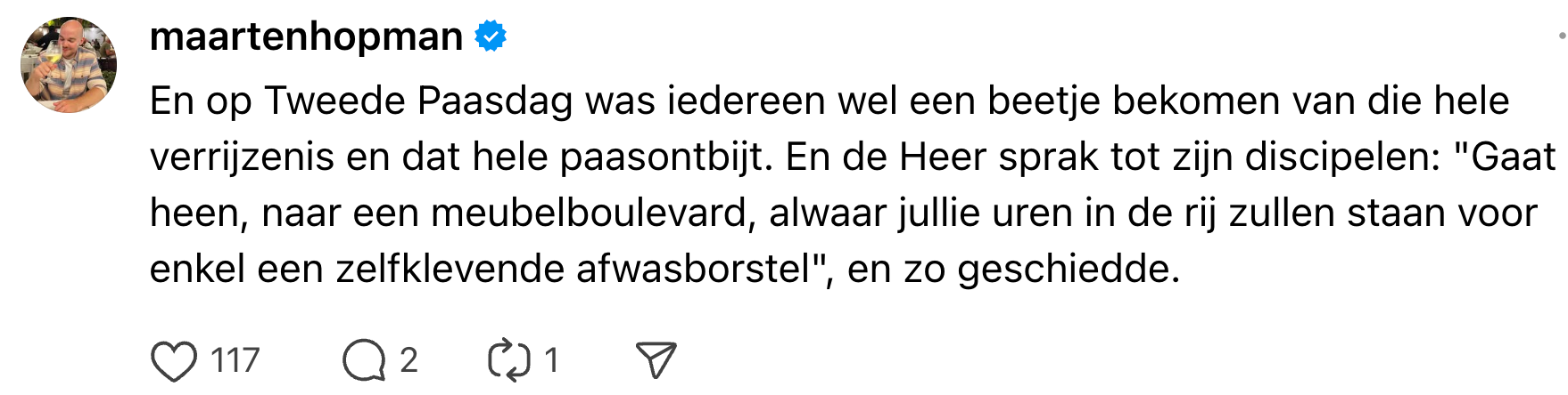 Als je meer tijd op Threads spendeert dan het stagiairtje van EasyToys, dan kan je eigenlijk bijna niet om hem heen: Maarten Hopman. Hij hopt van onderwerp naar onderwerp en bedolft het nieuws en andere actualiteiten onder een flinke dosis sarcasme. Vandaar dat hij genomineerd is voor The Best Social Awards in de categorie Beste Threader. Vraag je je nog steeds af of Maarten wel de juiste snaar raakt? Dan hebben we hier twaalf posts voor je die bewijzen dat hij zeker draadkrachtig te werk gaat.