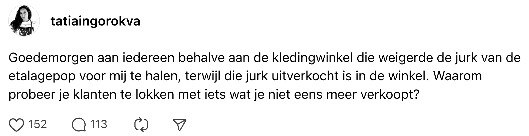 Als winkeleigenaar wil je je toekomstige klanten natuurlijk laten weten welke parels je allemaal in huis hebt. Daarom wordt alles uit de kast gehaald om de etalage zo mooi mogelijk te maken. Maar soms doe je dat zó goed, dat de producten uit de etalage binnen no time uitverkopen. Tatia wil graag zo’n jurk passen die niet meer in de winkel, maar nog wél in de etalage hangt. Ze vraagt of een medewerker het kledingstuk van de etalagepop af wil halen, en krijgt een antwoord dat haar en veel anderen nogal verbaast.
