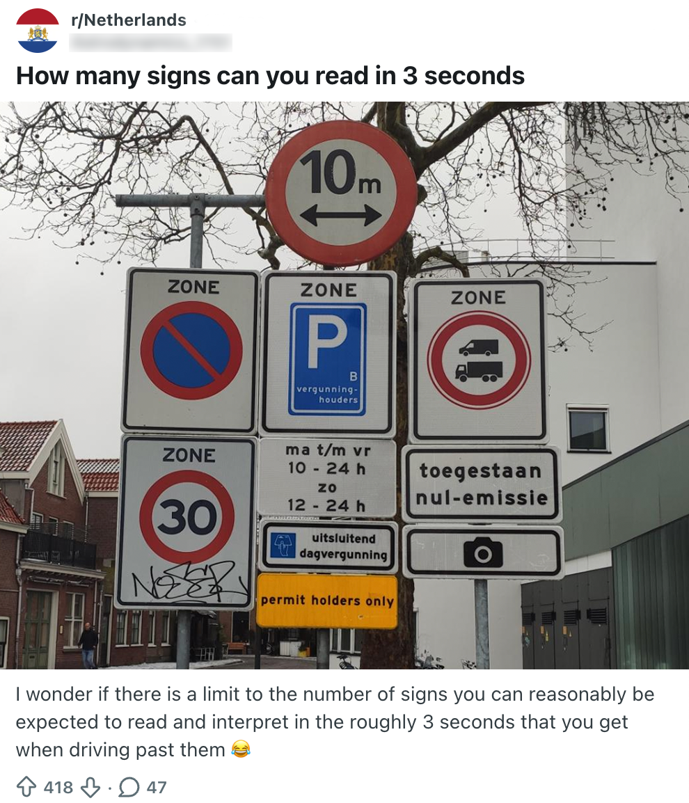 Tijdens het theorie examen voor je autorijbewijs wordt je hevig ondervraagt over allerlei verkeersborden. Achter zo’n scherm kun je lekker je tijd nemen en rustig nadenken, maar in de praktijk kan dat soms knap lastig zijn. Een Reddit-gebruiker rijdt langs deze verkeersborden en staat perplex van de hoeveelheid. Ook andere Nederlanders trappen op de rem.