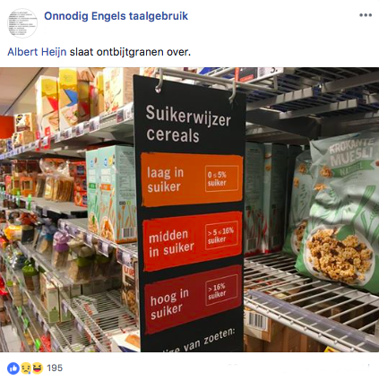 We hebben het al eerder in 2019 gezegd, maar we doen het gewoon nog een keer: volg Onnodig Engels taalgebruik op Facebook. Hierop worden de meest tenenkrommende kiekjes van, jawel, onnodig Engels taalgebruik gedeeld. Dus als jij ook helemaal gek wordt van alle onnozele Engelse termen die overal maar opgeplakt worden dan hebben wij het perfecte lijstje voor jou!