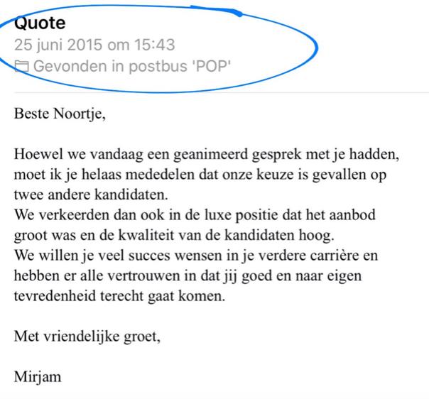 Solliciteren is een vak op zichzelf. Het hangt ook van zoveel factoren af: je moet net op het goede moment in het juiste plaatje passen. Soms ben je de perfecte match, maar komt het niet helemaal over. Het kan de beste overkomen. En daar is deze tweet van Noortje het perfecte voorbeeld van: