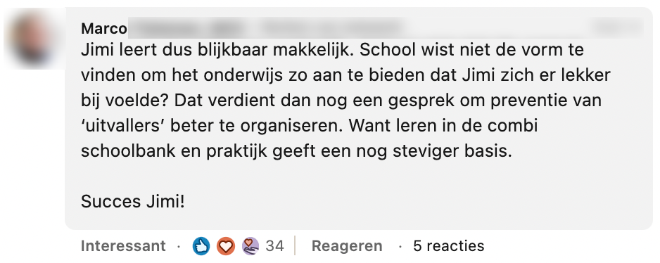 Het gaat de één beter af dan de ander: school. Waar de een met gemak tientallen woordjes in zijn of haar hoofd stampt, werkt de ander veel liever met de handen. In de laatste categorie valt de 15-jarige Jimi. Op school heeft hij het niet erg naar zijn zin, maar bij het aannemersbedrijf van Aad Meijndert bloeit hij helemaal op. Aad is vol lof over ‘zijn pupil’ en deelt zijn tevredenheid op LinkedIn.
