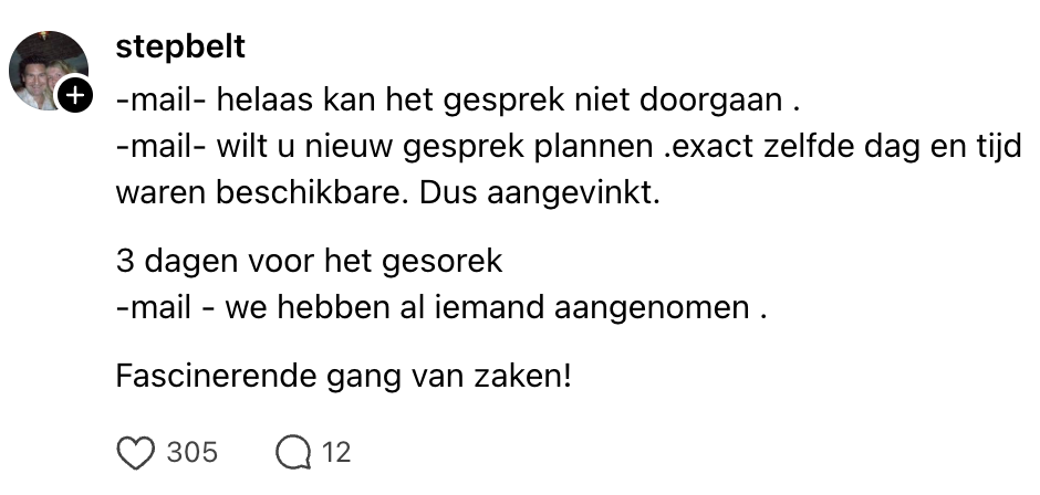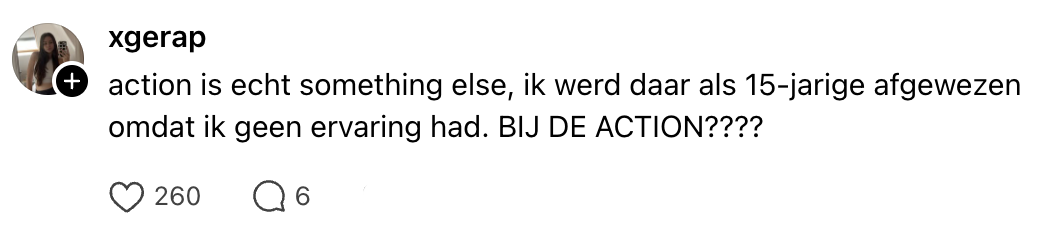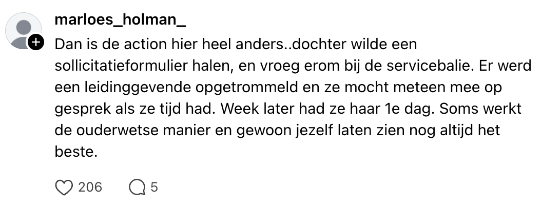 Bij solliciteren komt een hoop kijken. Je schrijft een motivatiebrief, checkt vijftig keer of je wel de goede naam noemt in de aanhef, stoft je cv af, verstuurt het hele hachje, en dan moet je ook nog eens een gesprek inplannen. Wanneer een tiener bij de Action solliciteert, blijkt vooral die laatste stap veel tijd in beslag te nemen. Uiteindelijk lukt het haar om een gesprek bij de winkel in te plannen, maar niet veel later krijgt ze een teleurstellend bericht: ze hebben iemand anders aangenomen. Haar moeder vindt de gang van zaken maar vreemd en deelt het hele verhaal op Threads.
