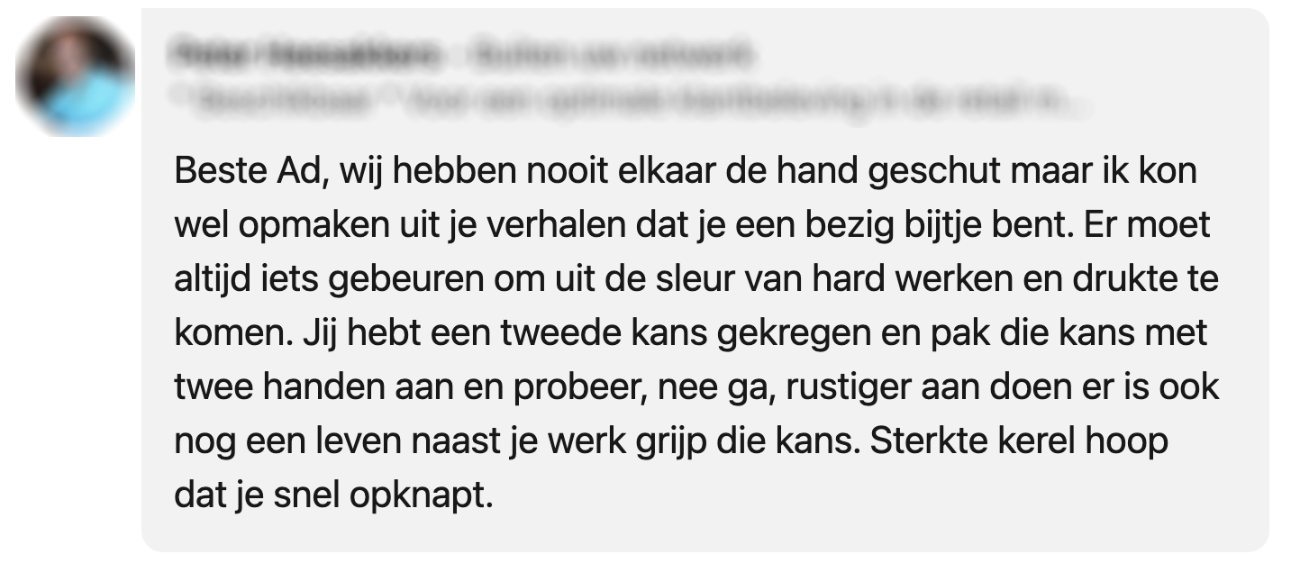 11. De desbetreffende foto zie je hieronder, met daarop een man aan de betere hand, zo vertelt Ad ons. “Nog steeds erg onwerkelijk, wat er is gebeurd. Een uur lang heeft mijn hart vier keer sneller geklopt dan normaal”, licht hij nog toe. “Hij had ook kunnen stoppen en dan was mijn leven ten einde geweest. Dat besef komt langzaam binnen. Ik voel me er bijzonder rustig onder, dankbaar en ook erg gelukkig. De hoeveelheid lieve berichten verrast mij. Dat maakt mij blij.” Beterschap, Ad!
