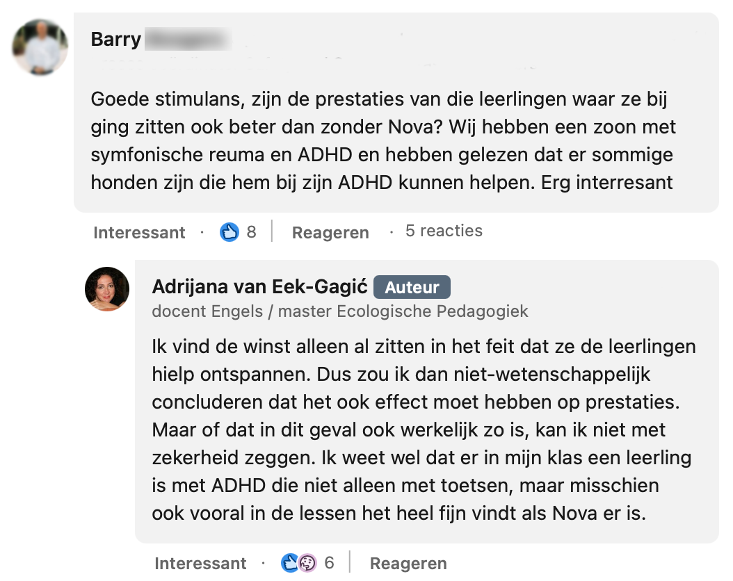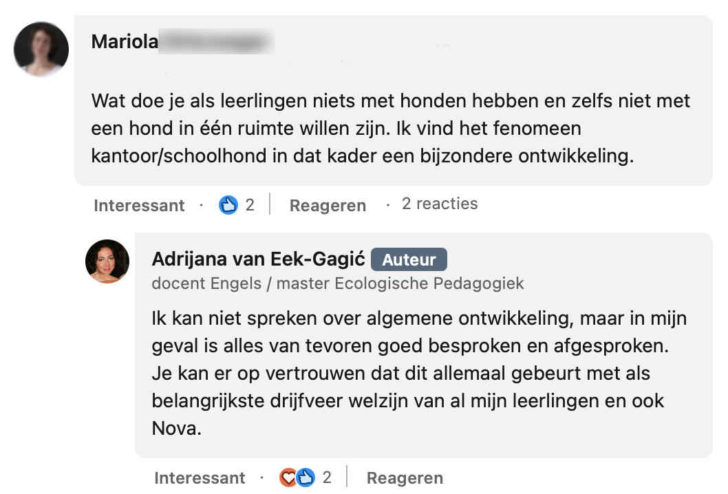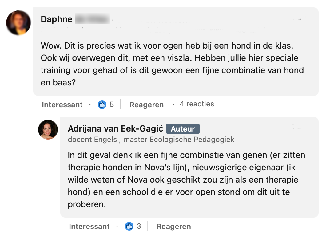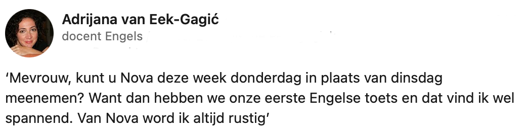 1. Leerlingen vragen vaak aan Adrijana of haar hond Nova wat vaker mee kan naar de klas.