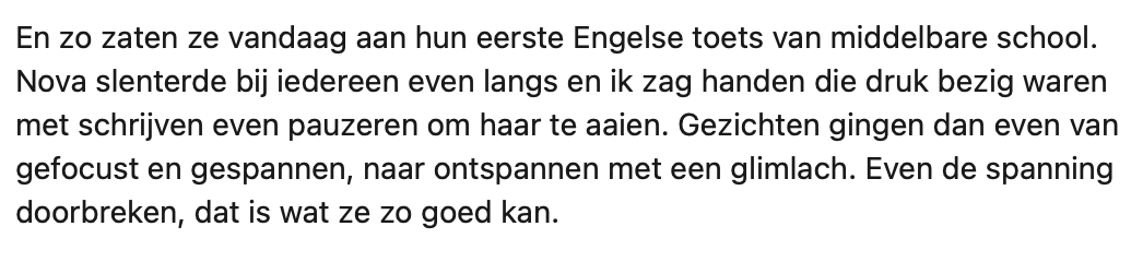 We weten allemaal dat een toetsmoment soms best wat stress teweeg kan brengen. Dit geldt al hélemaal als het je allereerste toets is op bijvoorbeeld de middelbare school. Adrijana is Engels-docente en neemt soms haar hond mee naar haar lessen. Ze merkt dat dit vaak veel bij de leerlingen losmaakt en deelt hier een bijzonder voorbeeld van op LinkedIn.