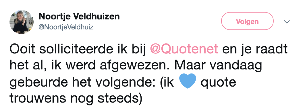 Solliciteren is een vak op zichzelf. Het hangt ook van zoveel factoren af: je moet net op het goede moment in het juiste plaatje passen. Soms ben je de perfecte match, maar komt het niet helemaal over. Het kan de beste overkomen. En daar is deze tweet van Noortje het perfecte voorbeeld van: