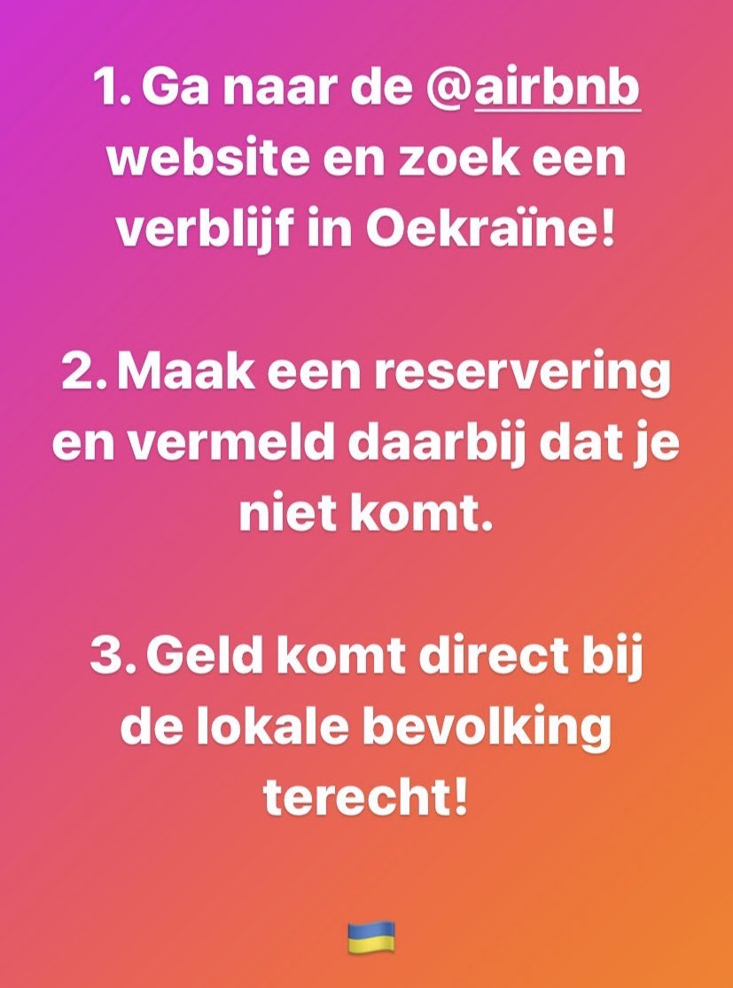 Er worden enorm veel creatieve manieren bedacht om de bevolking van Oekraïne te helpen. Mensen maken massaal geld over naar goede doelen, zamelen hulpmiddelen in en ook veel bedrijven laten hun stem horen. Eerder schreven we al over Russische Google reviews die werden achtergelaten om het echte oorlogsverhaal te vertellen en nu is er weer een nieuwe actie. Bart deelt op zijn Instagram een initiatief dat hij tegenkwam. In een paar simpele stappen legt hij uit hoe je via Airbnb de mensen uit Oekraïne kan supporten. Om nog een grotere groep mensen te bereiken wordt dit bericht nu ook op Twitter verspreid. De reacties van de Oekraïense Airbnb-verhuurders komen behoorlijk binnen.