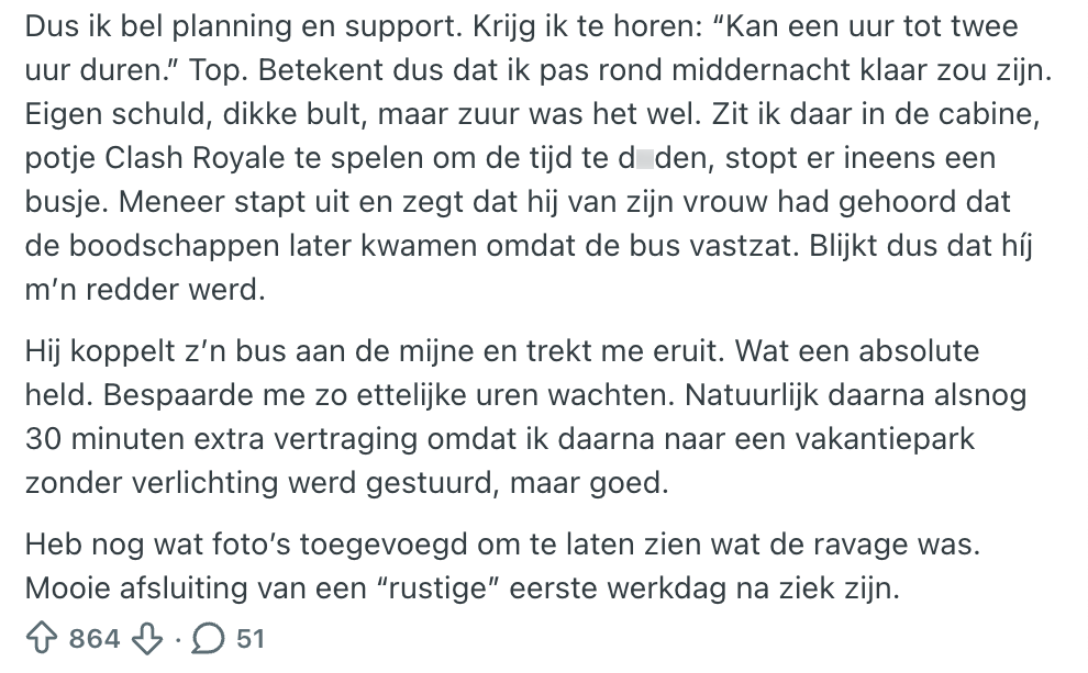 Boodschappenbezorgers moeten door weer en wind om alle XXL verpakkingen toiletpapier en blokjes kaas op tijd af te leveren. Het grote voordeel: ze zitten een groot gedeelte van de tijd in de bus, zodat ze niet aan hun lot worden overgelaten in de regen en de kou. Maar die bolide is geen wondermiddel dat ze uit elke situatie redt. Sterker nog, in dit geval is het juist de oorzaak van het probleem. Een Albert Heijn-bezorger komt namelijk vast te zitten in de berm met diens bus. Gelukkig wordt-ie snel uit de brand geholpen…
