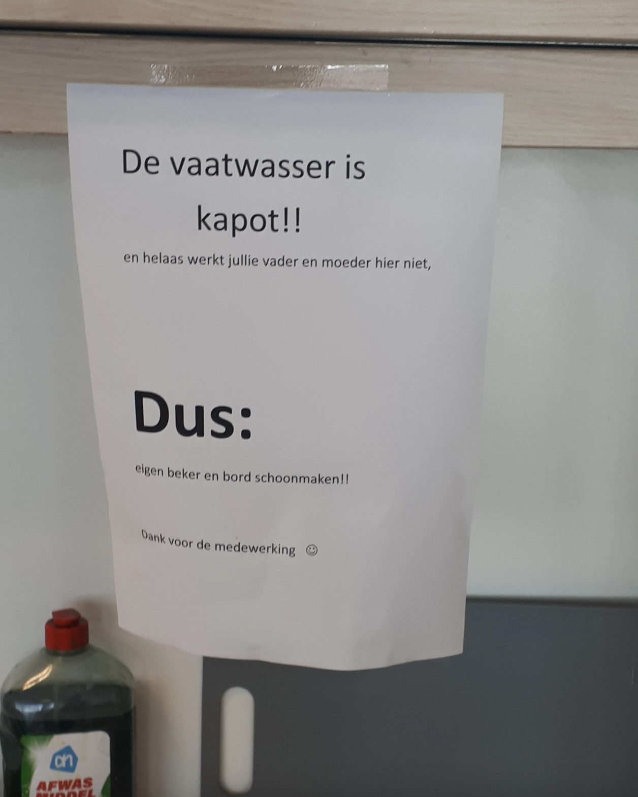 Als er binnen een bedrijf een probleem is, kun je dat op verschillende manieren duidelijk maken aan het personeel. Je kan een appje sturen in de groepsapp (die iedereen ongetwijfeld op stil heeft staan), het zo’n honderd keer vertellen tegen een aantal medewerkers of de mededeling op een briefje schrijven. Dít Albert Heijn-filiaal kiest voor die laatste optie. Wanneer de vaatwasser het begeeft, duurt het niet lang voordat er een briefje met het verschrikkelijke nieuws in de kantine verschijnt. Iemand deelt dit op Reddit en al snel gaan anderen ermee aan de haal.