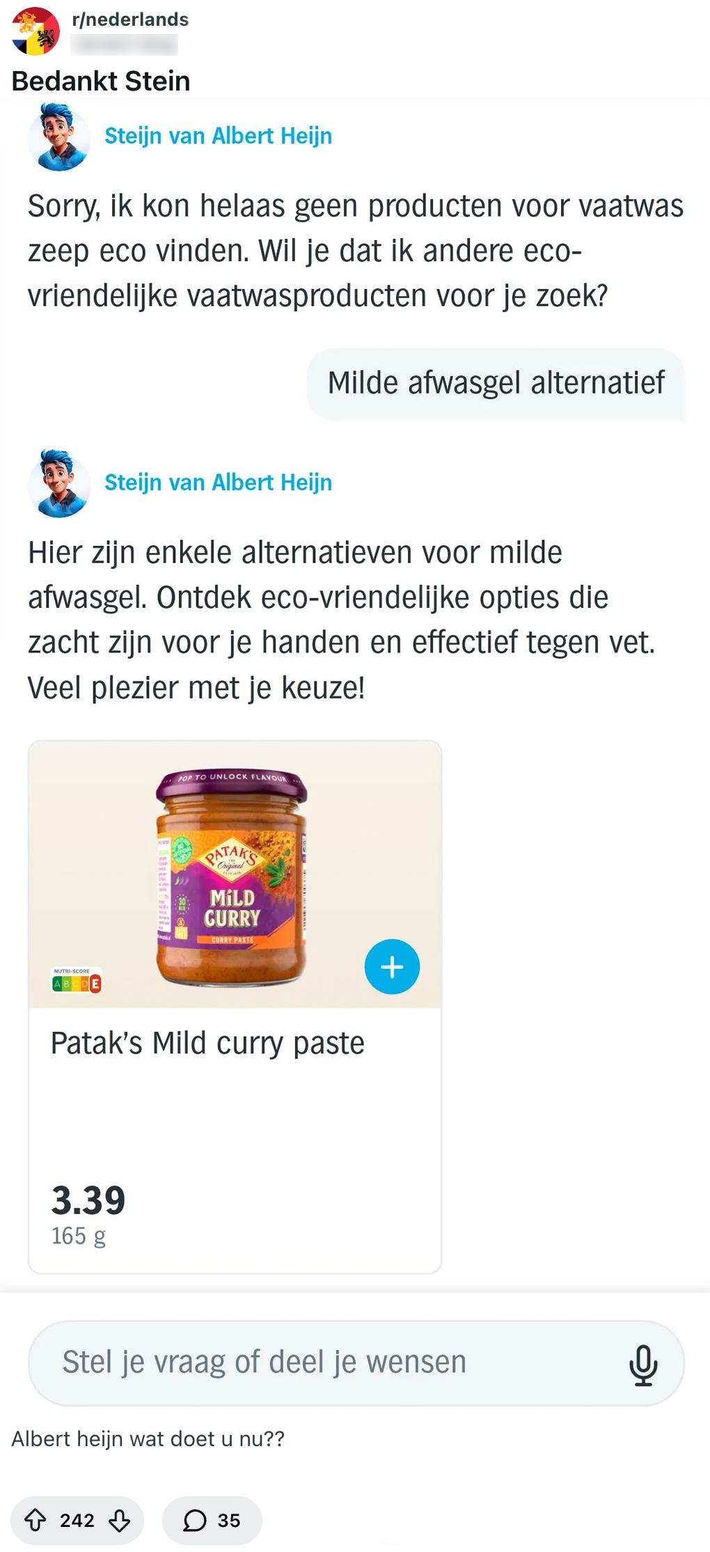 Van toiletten tot doucheputjes waardoor je je rot schrikt: schoonmaken is bijna nooit een pretje. Als je het (logischerwijs) zo min mogelijk wil doen, is het wel zo handig om alles grondig schoon te maken met een geschikt middeltje. Een klant vraagt chatbot Steijn van Albert Heijn naar een alternatief voor een bepaalde afwasgel, maar krijgt in plaats daarvan een ander opmerkelijk product voorgeschoteld.