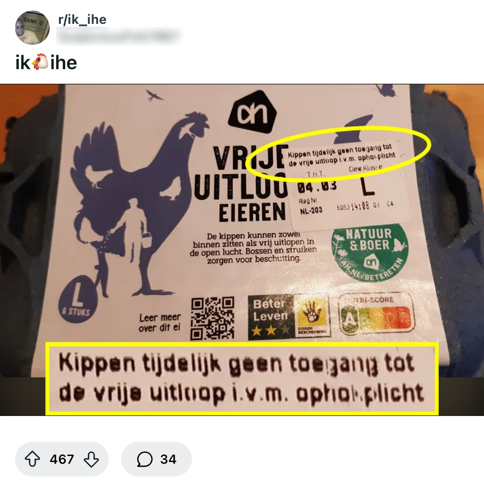 Het gemiddelde Nederlandse ontbijt bestaat uit niets meer dan een bammetje met kaas, een bak kwark of een zwarte koffie. Maar als je effe wil uitpakken, dan kan een eitje natuurlijk niet ontbreken. Omdat iedereen andere wensen en behoeften heeft, heeft Albert Heijn voor ieder wat wils. Zo kun je kiezen uit witte, bruine, biologische, maïs-, chocolade- of vrije-uitloopeieren. Die laatste variant springt in het oog door een opmerkelijke sticker op de verpakking, waar Nederlanders op Reddit hun ei over kwijt moeten.