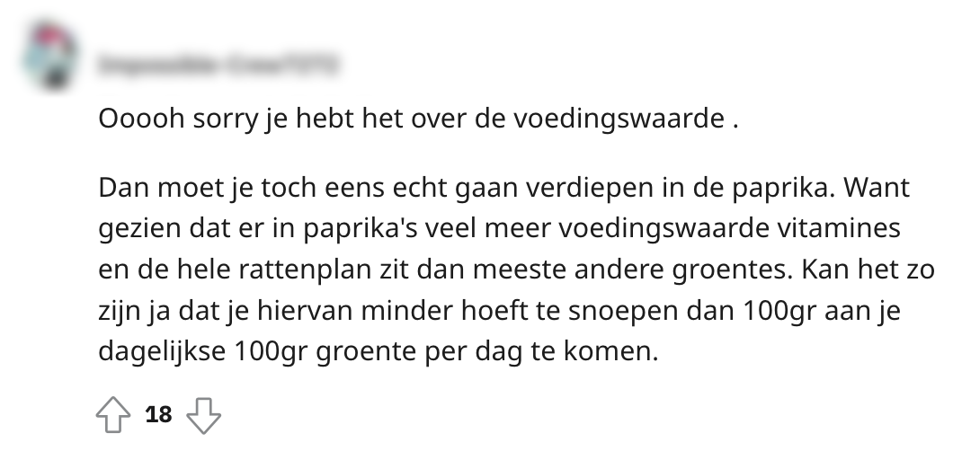 Om iedere dag genoeg groenten binnen te krijgen, kun je het beste een bak rauwkost op je bureau zetten en lekker gaan snacken. Volgens Albert Heijn hoef je zelfs maar drie snoeppaprika’s te eten om maar liefst honderd gram groenten binnen te krijgen. Maar voordat je het hele snoeppaprikaschap leegkoopt, wil een Reddit-gebruiker nog effe wat zeggen. Deze klant komt er met een simpele berekening namelijk achter dat de uitspraak van Albert Heijn niet helemaal klopt. Althans, dat denkt-ie. De reacties die het tegendeel bewijzen, stromen namelijk aan de lopende band binnen.
