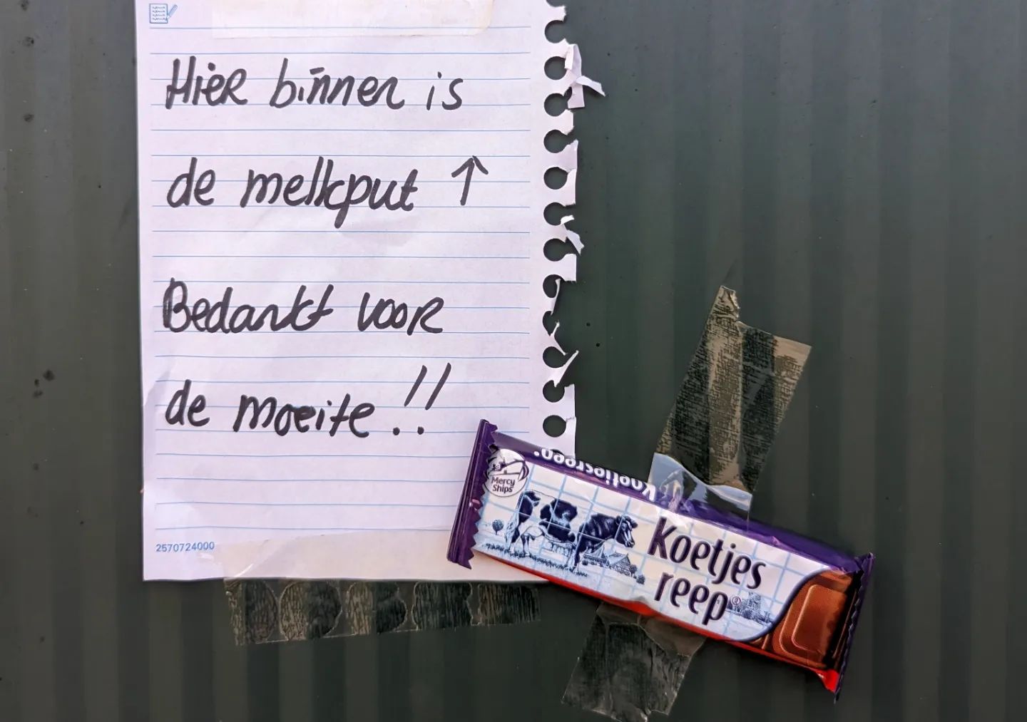 Als je in een rijtjeshuis woont, is het voor boodschappenbezorgers vaak geen probleem om je te vinden. Maar het zoeken naar klanten op een enorm erf op het platteland, kan voor hen nogal een speurtocht zijn. Dus waarom zou je er dan als klant niet meteen een letterlijke speurtocht van maken? Harry en Nanda hingen briefjes op hun deur die uiteindelijk leidden naar de plek waar hun Albert Heijn-bezorger moest zijn én naar een klein, heel toepasselijk cadeautje.