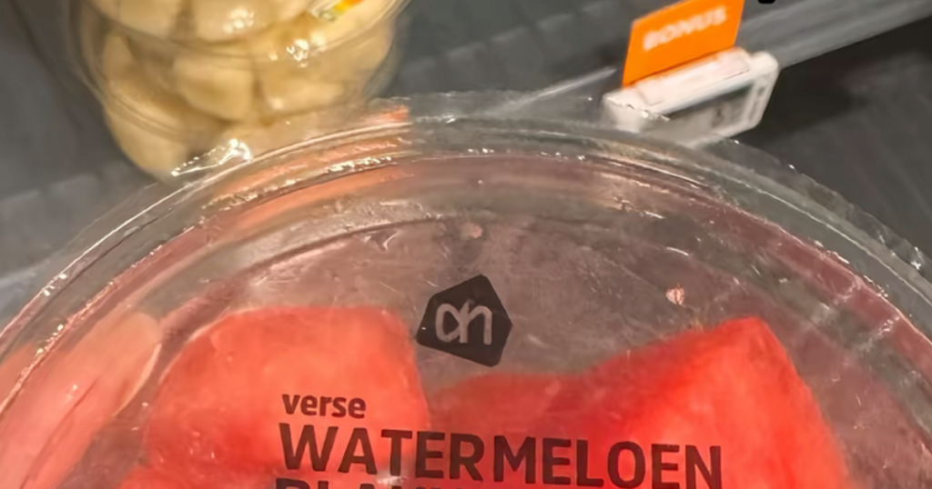 Als je groente of fruit gaat kopen in de supermarkt, is het essentieel om alles goed te inspecteren. Zo controleer je of er geen gigantische zachte plekken op je appels zitten en voer je nog net geen autopsie uit op een bakje aardbeien om erachter te komen of ze nog goed zijn. Wanneer Celine langs het fruitschap in de Albert Heijn loopt, spot ze een verpakking die is gevuld met watermeloen en blauwe bes, maar wel op een nogal opmerkelijke manier.