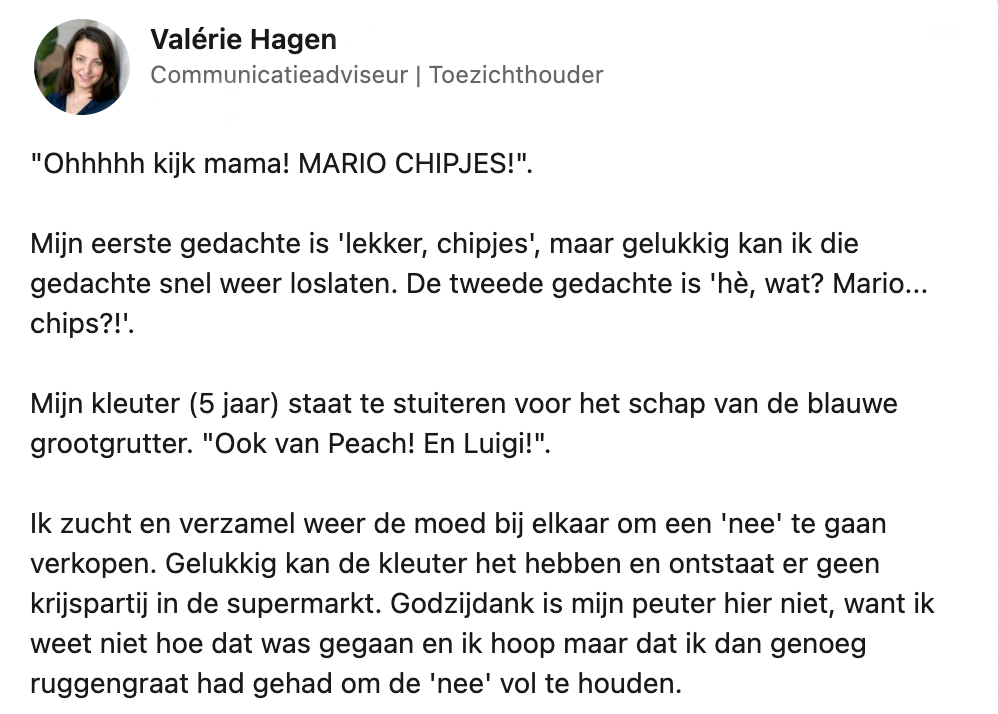 1. Valérie en (vooral) haar kleuter kunnen hun ogen niet geloven wanneer ze langs het chipsschap in de Albert Heijn lopen.