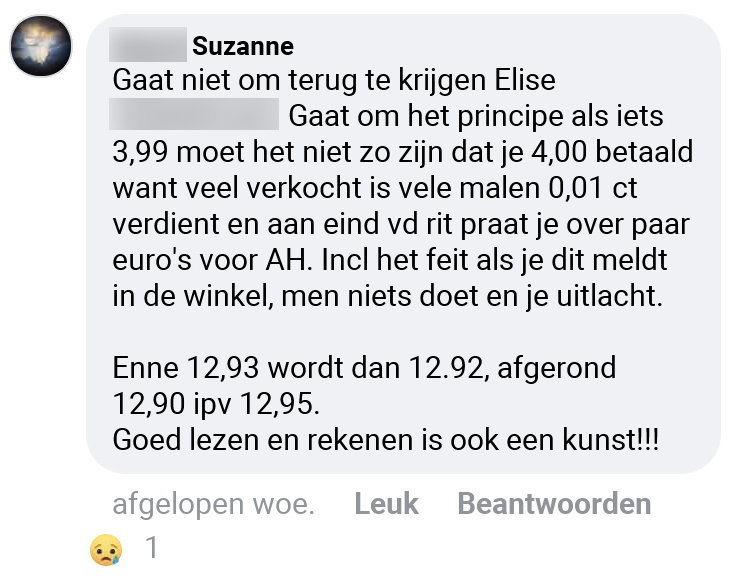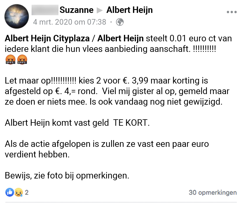 Het was destijds de Nationale week zonder vlees zijn, deze vrouw zal het een worst wezen. Zij maakte zich drukker om de 0,01 euro die ze misliep in Albert Heijn.