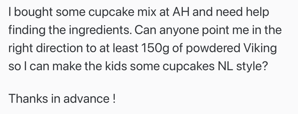 Het etiket op een cupcakemix scannen met Google Lens: wat kan er misgaan? Nou, blijkbaar een hoop. Deze Albert Heijn-klant wil weten wat-ie zelf moet toevoegen en probeert de lijst met benodigdheden te vertalen. Google Lens heeft echter geen zin in poedersuiker op de cupcakes en komt met een nogal lugubere suggestie voor een topping.