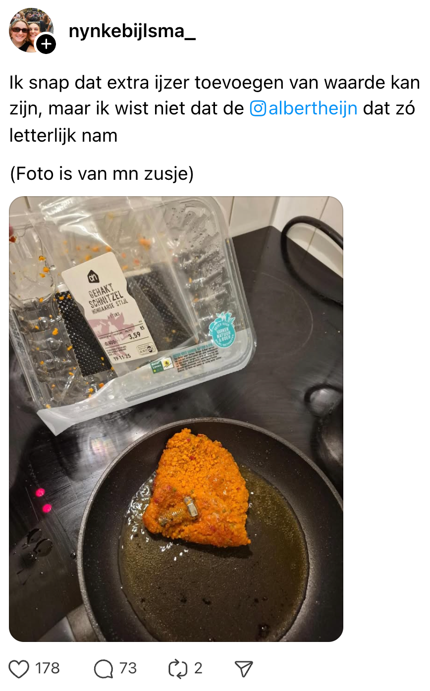 Waar sommige mensen alles wat los en vast zit in hun bek stouwen, houden anderen juist nauwkeurig bij wat ze binnenkrijgen: minimaal twee liter water, tweehonderd gram groenten, twee stuks fruit én zo’n elf milligram ijzer per dag. De zus van Nynke probeert een gebalanceerde maaltijd op tafel te zetten en legt daarom een schnitzel van Albert Heijn in de pan. Maar zodra ze die omdraait, ziet ze in één oogopslag dat er veel te veel ijzer in zit. Sterker nog: het is zóveel dat voor de rest van het jaar niet meer naar je ijzerinname hoeft om te kijken.